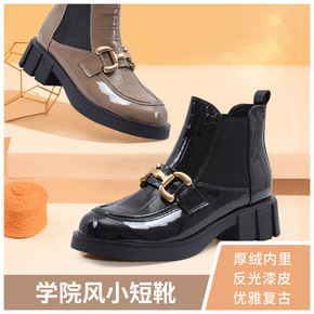 切尔西靴子真皮厚底短筒烟筒靴子女头层牛皮漆皮短靴高...
