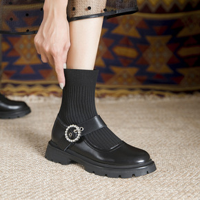 2021新款秋冬真皮小皮鞋女弹力袜靴粗跟玛丽珍单靴...