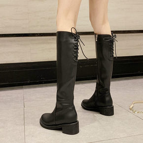 2020新款弹力骑士靴女高筒中跟粗跟后系绑带时尚显...