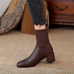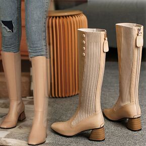 高端品质2022秋冬真皮粗跟中筒靴骑士靴高跟针织弹...