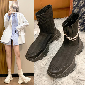 针织弹力袜靴女2022冬季新款韩版串珠链条短筒厚底...
