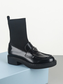 顶版欧美三角标乐福鞋女弹力针织袜子靴开边珠牛皮厚底...