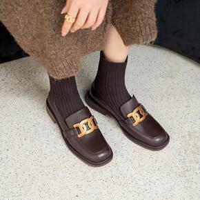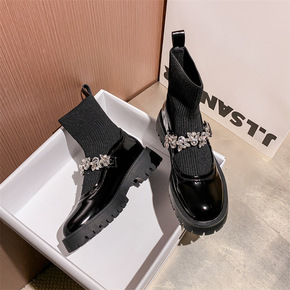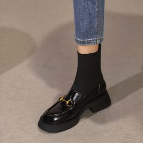 2021秋冬新款英伦风弹力袜靴马衔扣短靴女粗跟漆皮...