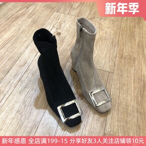 现韩国女鞋20秋欧美气质金属方扣绒面显瘦拼接侧拉链...