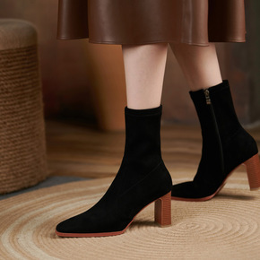 气质高跟短靴女尖头粗跟瘦瘦靴2021秋冬新款绒面裸...