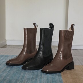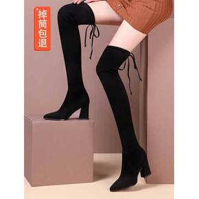 2021年秋季新款软面舒适尖头时尚弹力靴粗跟烟筒靴...