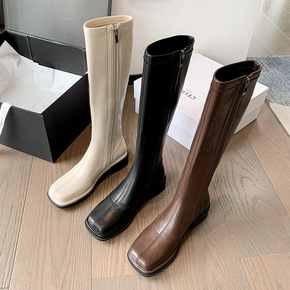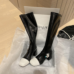 艾小渔小香风漆皮长靴女粗跟2021年拼色显瘦骑士靴...
