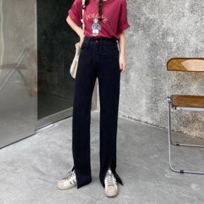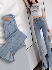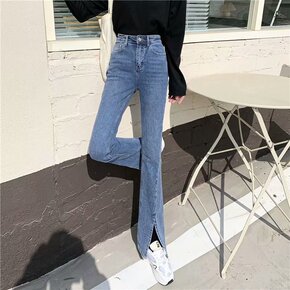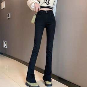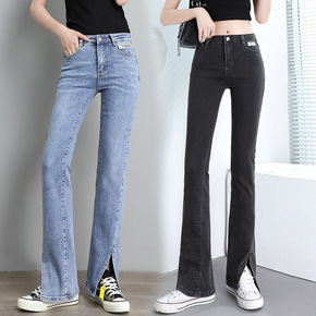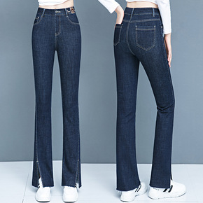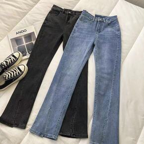 品牌前开叉喇叭牛仔裤女2021秋冬款韩版显瘦高腰休...