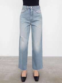 开叉牛仔裤女春装2021年新款宽松高腰垂感显瘦阔腿...