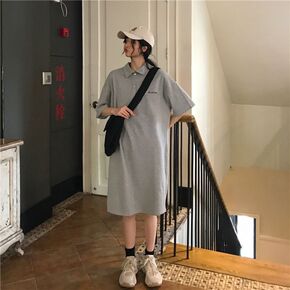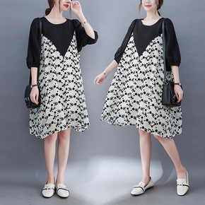 胖妹妹港风宽松遮肚拼接鱼尾连衣裙潮2021年夏季新...