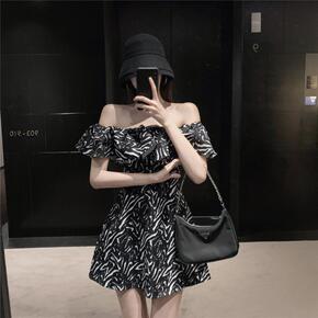 冷淡风女装感法式气质小黑裙子可盐可甜斑马纹一字肩连...
