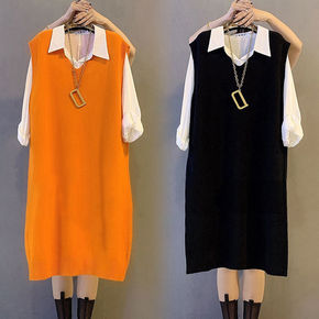大码女装2021秋季新款胖妹妹针织拼接减龄显瘦遮肚...