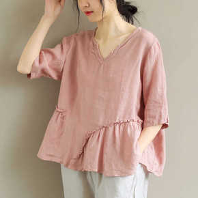 微胖文艺大码V领时尚木耳边下摆减龄T恤夏季女装新款...