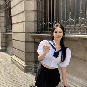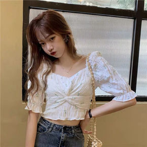 泡泡袖心机短款白色打底衬衫女士夏季设计感小众短袖衬...
