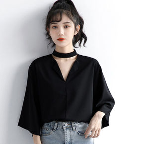 2021春夏新款黑色七分袖衬衫女时尚洋气小心机设计...