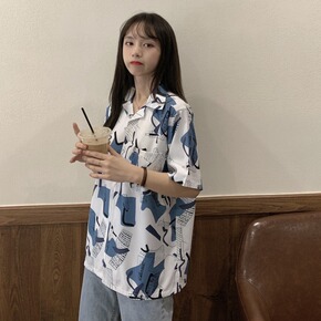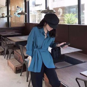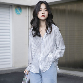 港味ins条纹慵懒风衬衣女2021翻领长袖早秋新款...