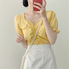 褶皱短袖衬衫复古方领法式锁骨心机小众设计感显瘦泡泡...