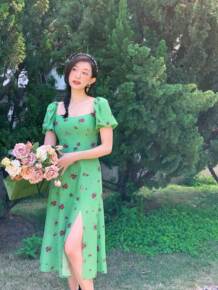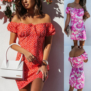 欧货欧洲站女装性感锁骨方领泡泡袖蝴蝶结后背碎花重磅...
