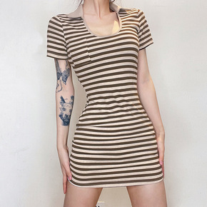 夏季性感名媛低胸方领短袖t恤裙弹力修身包臀连衣裙小...
