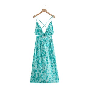 外贸跨境现货2022欧美春夏新款性感露背绑带印花修...