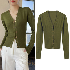 2021年春季新款气质修身V领牛油果色钩扣针织衫开...