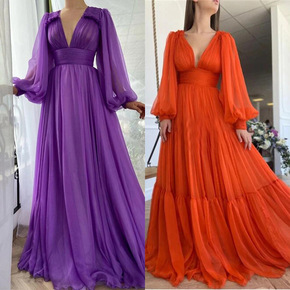 欧美外贸高腰长裙wish网纱长袖婚纱礼服大摆晚礼服...