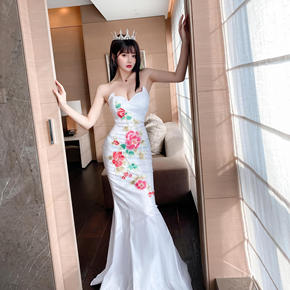 2022白色蕾丝仙女气质晚礼服亚马逊性感露背婚纱婚...