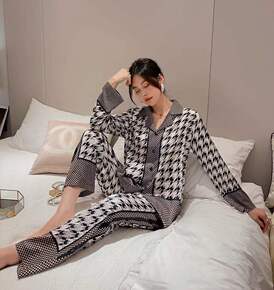 春秋季新款冰丝性感睡衣女高级感网红同款千鸟格丝绸长...