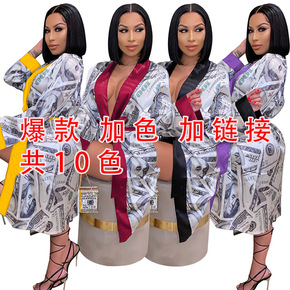 2021欧美跨境女装 时尚性感定位印花系带风衣中长...
