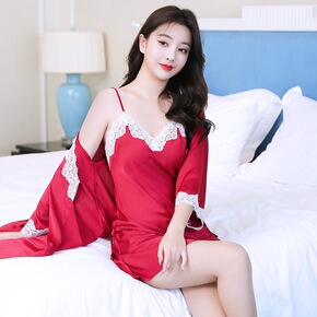 睡衣女春秋冰丝可外穿长袖丝绸家居服性感红色两件套女...