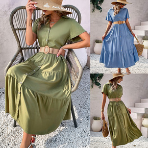 eBay速卖通夏季性感不对称大摆V领女装高腰中长连...
