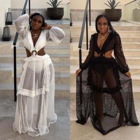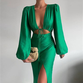 绑带镂空深V连衣裙女欧美度假春夏2022新款灯笼袖...