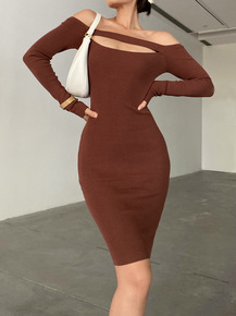 秋季性感胸前镂空设计一字肩长袖修身弹力包臀针织一步...