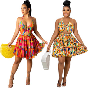 跨境新款连衣裙欧美女装亚马逊2021夏季爆款印花蕾...