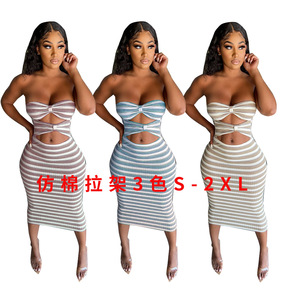 6692亚马逊跨境新款欧美女装性感条纹修身镂空无袖...