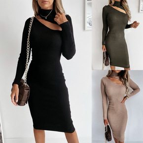 跨境2021秋冬新款女装长袖中裙纯色性感斜肩修身皱...