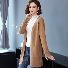 恒源祥羊毛针织开衫女秋冬外穿中长款披肩外搭宽松慵懒...