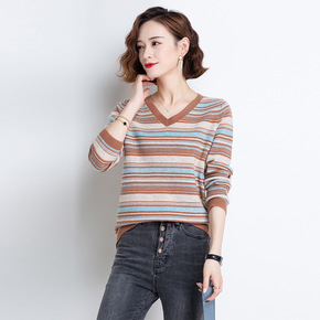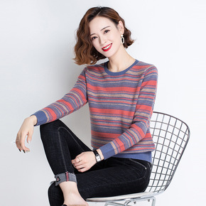 恒源祥羊毛衫女圆领2021新款秋季条纹羊毛套头针织...