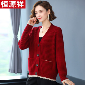 恒源祥羊毛开衫女2021秋新款V领大码长袖外穿针织...