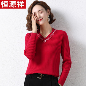 恒源祥羊绒衫秋冬新款v领女士毛衣内搭外穿套头上衣针...