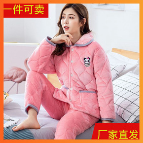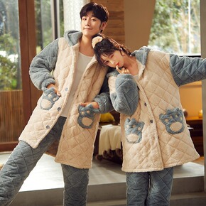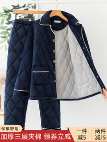 冬季男士加绒加厚三层夹棉袄冬款珊瑚绒大码睡衣法兰绒...