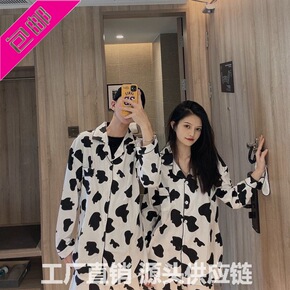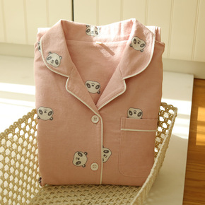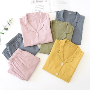 棉质双层纱布多色睡衣情侣款男女春秋薄款长袖长裤开衫...