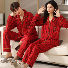 春季新款棉质睡衣套装长袖开衫情侣家居喜庆中国结花纹...