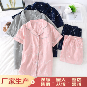 日系情侣睡衣男女纯棉纱布春夏季格子短袖长裤薄款家居...