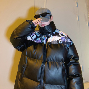 拼接PU皮棉衣男秋冬季韩版潮牌宽松加厚情侣羽绒棉服...