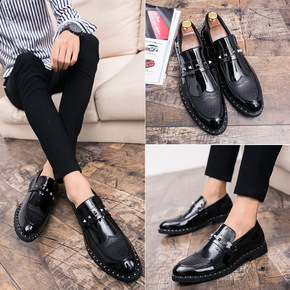 2020秋季新款英伦亮面休闲铆钉小皮鞋时尚潮流黑商...