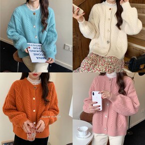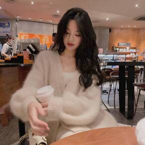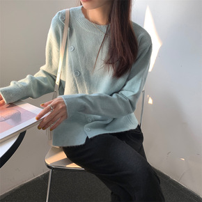 女装秋冬新款v领单排扣针织开衫外套宽松慵懒风毛衣女...