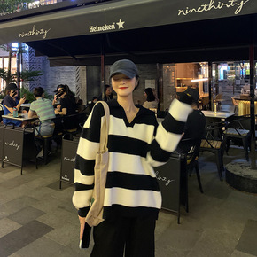 毛衣复古日系慵懒春秋新款别致上衣韩版宽松蓝色条纹v...