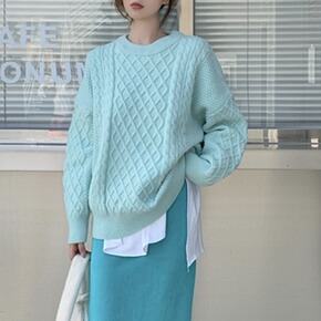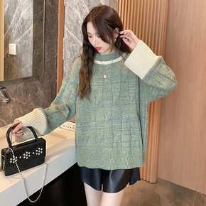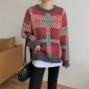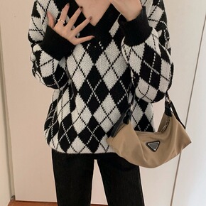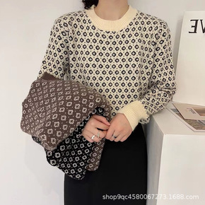 休闲慵懒风圆领套头菱格毛衣女设计感小众春秋宽松外穿...