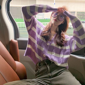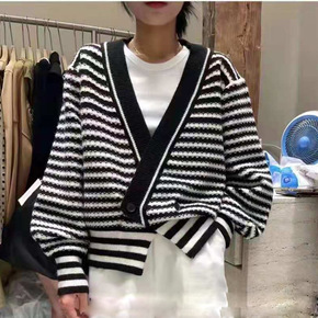 复古条纹v领毛衣外套女春秋2021新款网红宽松慵懒...